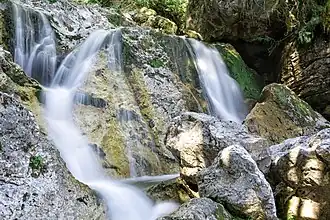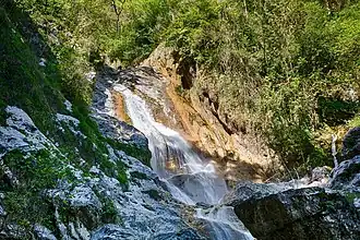 Ochkhomuri Waterfall Natural Monument (Georgian: ოჩხომურის ჩანჩქერის ბუნების ძეგლი) is a waterfall with a height of 100–120 m at 469 m above sea level in Martvili Municipality, Samegrelo-Zemo Svaneti region of Georgia. It originates in cave at Migaria limestone massif, at the source of Ochkhomuri River. At first the waterfall flows from the slope of the southern exposure, then in the middle it turns into south-eastern exposure, whereas the last part flows from the southern exposure. Each step of the waterfall creates small lake after touching the ground. From afar the waterfall looks like a solid column. The excessive humidity around the waterfall gives way to peculiar flora and fauna. One can find abundance of rare, endemic or relict species here.[1]