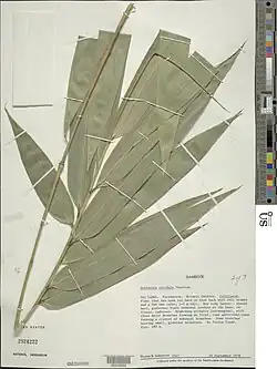 Culm sheath is green in young plants, the straw becomes colored when mature. Culm sheath is triangular and broad at base, curved downwards at the tip. The sheath is small and narrow-lengths of sheath proper 10–15 cm long and 4–8 cm wide. Auricles are small and sickle-shaped. Upper surface of the culm sheath is hairy and lower surface is without hairs. Sheaths are persistent.
