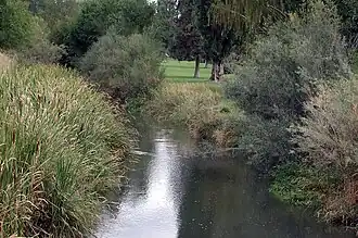 Flowing west from the lower end of the lake at about RM 9 (RK 14), the creek runs through the Prineville Golf and Country Club, passes under Highway 26 and enters Prineville and Ochoco Creek Park north of the highway at about RM 4 (RK 6). Turning northwest out of Prineville, the stream soon passes under Highway 26 again and enters the Crooked River roughly 47 miles (76 km) from its confluence with the Deschutes River, a tributary of the Columbia River.[4][5]