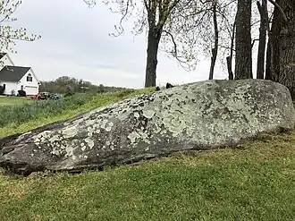 The Octonia Stone, also known as Octoney, Octeny, Octona, and Octuna Stone, is a historic boundary marker located near Stanardsville, Greene County, Virginia. The stone marks the terminus of the westernmost boundary line of the 24,000-acre Octonia Grant. It is a granite-type rock which is part of a natural outcropping in a hayfield. The stone is engraved with a figure 8, composed of two, nearly perfect circles, with a cross touching the top of the 8.[3]