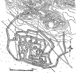 Oda Castle is located at the foot of Mount Oda and was originally little more than a fortified manor house with a moat and earthen rampart. During the Sengoku period, it was expanded to include a second, third and fourth concentric enclosure, each with an elaborate maze-like system of water moats. The main residence was located between the inner most and second moat, and occupies as rectangular area approximately 120 by 140 meters. Yagura watchtowers were located at the west, east and south corners. The main gate of the castle was to the north, and the clan's bodaiji temple was to the west. In total, the castle measures approximately one kilometer from east to west, and 700 meters north–south.[2]