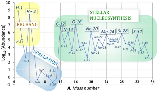 The Oddo–Harkins rule may suggest that elements with odd atomic numbers have a single, unpaired proton and may swiftly capture another in order to achieve an even atomic number and proton parity. Protons are paired in elements with even atomic numbers, with each member of the pair balancing the spin of the other, thus enhancing nucleon stability. A challenge to this explanation is posed by , which is highly abundant in spite of having an unpaired proton. Additionally, even-parity isotopes that have exactly two more neutrons than protons are not particularly abundant despite their even parity. Each of the light elements oxygen, neon, magnesium, silicon, and sulfur, have two isotopes with even isospin (nucleon) parity. As shown in the plot above, the isotope with an equal number of protons and neutrons is one to two orders of magnitude more abundant than the isotope with even parity but two additional neutrons.
