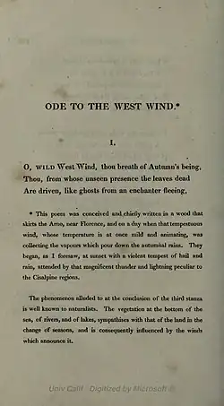 "Ode to the West Wind" is an ode, written by Percy Bysshe Shelley in 1819 in arno wood[1] near Florence, Italy. It was originally published in 1820 by Charles Ollier in London as part of the collection Prometheus Unbound, A Lyrical Drama in Four Acts, With Other Poems.[2] Perhaps more than anything else, Shelley wanted his message of reform and revolution spread, and the wind becomes the trope for spreading the word of change through the poet-prophet figure. Some also believe that the poem was written in response to the loss of his son, William (born to Mary Shelley) in 1819. The ensuing pain influenced Shelley. The poem allegorises the role of the poet as the voice of change and revolution. At the time of composing this poem, Shelley without doubt had the Peterloo Massacre of August 1819 in mind. His other poems written at the same time—"The Masque of Anarchy", Prometheus Unbound, and "England in 1819"—take up these same themes of political change, revolution, and role of the poet.[3]