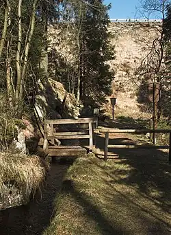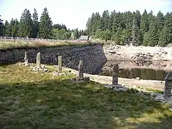 When the Oderteich is fully emptied the remains of coffer dam can be seen about 200 metres above the main dam. This was built in 1898 when the Oderteich Reservoir was empty in order to reduce the water flow whilst repairs were carried out to the bottom outlet. The coffer dam must have been demolished immediately after this repair had been completed.[4]