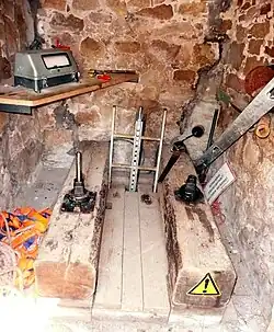 The tendency for the Oderteich to use particularly long-lasting materials is best demonstrated in the design of the bottom outlet. At the lowest point in the valley, a shaft was let into the dam, that had a cross-section of about 1.10 × 1.20 m. This shaft is edged with large, hewn granite blocks and descends to the natural floor of the valley. From the bottom of the shaft runs a tunnel, 0.75 metres wide and 0.90 metres high into the reservoir. This tunnel enables the water in the reservoir to equalise with the water level in the shaft. From the bottom of the shaft, two wooden chutes (Holzgerenne) lead to the downstream side of the dam base. These chutes, made of oak, have a right-angled cross-section of about 25 × 25 cm and feature a valve on the bottom of the shaft that operates in a similar way to the type of bathplug that is closed from below. This valve can be pushed up or pulled shut using a rod operated from the control hut or Striegelhaus positioned above the shaft. The oak chute is designed in such a way that, even when the valve is shut, it remains submerged in water and so does not rot. This explains why the oak chutes fitted in 1715 are still being used. The entire bottom outlet design is known in the Upper Harz as a Striegel.[4]