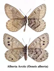 Oeneis alberta, the Alberta Arctic, is a butterfly of the family Nymphalidae. It is found from the Canadian prairie provinces east to southern Manitoba. Isolated populations are found along the Rocky Mountains in Colorado, New Mexico and Arizona.[2]