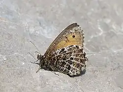 The upper side of the Alpine Grayling has a pale gray (males) or pale brown (females) basic tint. The dark gray marbled underside of the hind wings is traversed by white wing veins. If you take a cursory look in its alpine habitat, in central Europe the species can only be confused with Lasiommata petropolitana or Lasiommata maera. However, both have large, conspicuous eye-spots on the upper sides of both wings, which the Alpine Grayling lacks.[1]