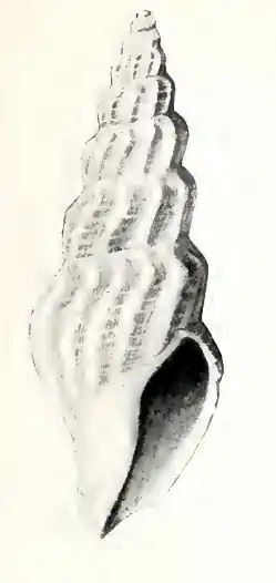 (Original description) The small shell is white and polished. The protoconch has an oblique smooth small apex and about one whorl, the latter part spirally striated. It has about 6½ subsequent whorls. The spire is acute and slender. The whorls are moderately rounded. The suture is distinct, not appressed. The spiral sculpture consists of a few obscure threads on the back of the siphonal canal and on the apical whorls. The axial sculpture consists of (on the body whorl about 15) sigmoid ribs, most prominent at the shoulder, feeble over the anal fasciole and on the base. The aperture is narrowly ovate. The anal sulcus is shallow and wide, beginning at the suture. The outer lip is produced, thin and sharp. The inner lip and the columella show a thin wash of enamel. The columella is straight and attenuated in front. The siphonal canal is short and narrow.[1]