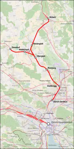 On 1 May 1865, the BR opened its approximately 16 km-long Oerlikon–Oberglatt–Bülach main line and its just over 4 km-long Oberglatt–Dielsdorf branch line, which later became part of the Wehntal Railway (Wehntalbahn).