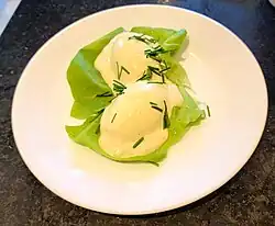 A serving consists of a large chicken egg, which is almost hard-boiled, although it is removed from the heat while the yolk retains a little creaminess. The egg is then chilled, peeled and halved lengthwise. The halves are presented face down on a plate, resembling white domes. Then, the egg halves are entirely covered with a sauce consisting of mayonnaise and Dijon mustard, thinned with enough water or lemon juice that it can be poured with a spoon.[2][3]