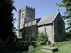 The Anglican Church of St Andrew has 12th-century origins and work from that century survives in the north door (with chevron hoodmould) and details of the arcades; the piscina at the south side is a re-used capital.[4] The chancel (with south door) was built in the 13th century. In the 15th century the west tower was inserted, and the church was re-roofed and the clerestory added.[5]