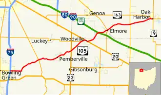 State Route 105 (SR 105) is an east–west state highway in the northwestern portion of the U.S. state of Ohio. Its western terminus is at an interchange with Interstate 75 in Bowling Green that doubles as the southern terminus of State Route 64, and its eastern terminus is at State Route 19 in Oak Harbor. For its final 0.4 miles (0.64 km), the route overlaps State Route 163 which continues east.