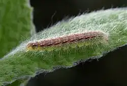 The larvae feed on common fleabane (Pulicaria dysenterica) and ploughman's-spikenard (Inula conyza). They initially feed in the shoots, but later feed on the leaves.[4][5]