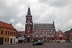Most of the civilian population in Courrières had sought shelter from the fighting in cellars and basements. German soldiers nonetheless massacred four local civilians on the street on 27 May.[6] Early the following morning, they took roughly a dozen civilians hostage and attempted to use them as human shields to protect German artillery pieces near the bridge.[8] They also systematically began to burn the town. The historian Jean-Marie Fossier wrote that soldiers went "street to street" throwing incendiary grenades into houses as they passed.[8] According to post-war estimates, 951 buildings were totally destroyed and 220 partially destroyed out of a pre-war total of 1,605.[9] Three schools, the town hall, several other civic buildings, and the historic local church were among the buildings destroyed.[8] Several more civilians were shot, bayonetted, or died in the fire.[8] Fossier noted that "In one courtyard, nearly 20 men were gathered. Several were retirees. One had been wounded by a bullet. There were also several Algerians. They were made to dig a large pit after a pretend judgment." They were then killed with machine-gun fire and buried. Later excavation suggested that some had been buried alive.[8]