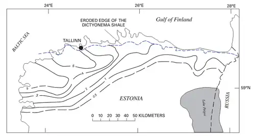 Graptolitic argillite was formed some 480 million years ago during the Early Ordovician under a marine environment.[12] In mainland Estonia, it occurs at the foot of the North Estonian Klint, ranging from the Pakri Peninsula to Narva in an area covering about 11,000 square kilometres (4,200 sq mi).[12][13] When findings in the western Estonian islands are included, its extent increases to about 12,200 square kilometres (4,700 sq mi).[9] The thickness of the layer varies from less than 0.5 metres (1 ft 8 in) to a maximum of 8 metres (26 ft) in western Estonia, and its depth below the surface varies from 10 to 90 metres (33 to 295 ft).[13]