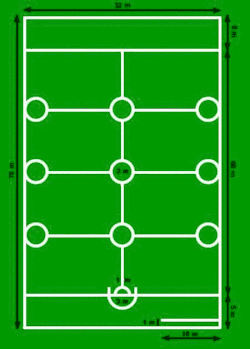The pitch is a rectangle, 70 metres (230 ft) long by 32 metres (105 ft) wide divided into: