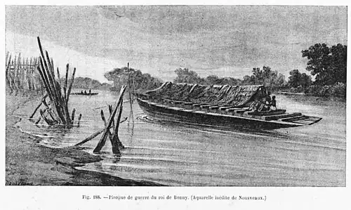 Bonny had a navy of war canoes for protecting and extending trade routes. War canoes were associated with canoe houses and such houses often had 10 or more war canoe chiefs.[7] Primary sources of the late 18th century stated that Bonny's vessels were equipped with bow cannon or guns of large calibre, mounted on the bow.[8][7] Such vessels could carry 140 people.[7]