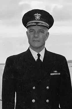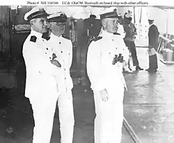 In 1933, Hustvedt was promoted to commander[22] and became executive officer of the heavy cruiser USS Louisville (CA-28), then moved to the staff of the Chief of Naval Operations in Washington, D.C., in 1935.[23] In 1938 he was promoted to captain and took command of the light cruiser USS Detroit (CL-8).[24] In 1939 he joined the staff of the Commander, Battle Force, United States Fleet, Admiral James O. Richardson, serving aboard Richardson's flagship, the battleship USS Pennsylvania (BB-38), as Richardson's operations officer before reporting to the New York Navy Yard in Brooklyn, New York, to oversee the fitting out of the new battleship USS North Carolina (BB-55). He became North Carolina's first commanding officer upon her commissioning on 9 April 1941.[25][26] On 23 October 1941,[27] Hustvedt became chief of staff for the Commander-in-Chief, United States Atlantic Fleet, Admiral Ernest J. King.[28][29]