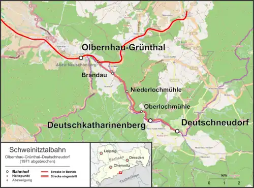 1. ^ a b c d "Olbernhau-Grünthal - Deutschneudorf. Schweinitztalbahn". Sachsenschiene. 28 February 2016.