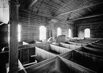 The 40-foot (12 m) by 60-foot (18 m) church has been repaired and painted on the exterior. It is particularly known for its simple, original interior, now one of only about a dozen in the Atlantic Coast of the United States that have never been plumbed or electrified. Only the window sashes are painted, and the pulpit stands on the middle of the north wall, with an altar at the east end. Box pews are high, with doors to each family section, signified by chalked names. The ceiling is a flattened barrel vault. A gallery remains at the west end, reached by stairs; it was once used for slaves and free negroes, with seats but no back rests.[5]