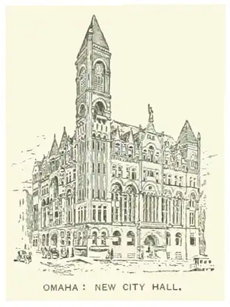 After an 1889 architectural competition won by Omaha architects Fowler & Beindorff,[2] the City Hall was built by the construction firm of John F. Coots from Detroit, Michigan. The building cost approximately $550,000 to construct, and included several interesting features. A raised basement and first floor were built of granite, while the second through fifth floors were of red sandstone. Solid oak lined every interior wall, while the Victorian-style city council chamber featured a large brass chandelier. There were murals throughout the building by artist Gustave Fuchs, and "birdcage" elevators brought guests to the sixth floor of the building, which was added in 1916. Marble stairs led from the main entrance to a second-floor atrium court, and at the southwest corner of the building a clock tower rose nearly 20 stories into the air. A steepled roof crowned the building, with gargoyles abounding.[3]