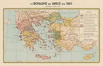 In modern Greek history, the term "Old Greece" refers to the Kingdom of Greece before the Balkan Wars of 1912–1913, including the Peloponnese, all of Central Greece, and the Cyclades, which formed the initial independent Greek state in 1832; the Ionian Islands, annexed in 1864; and Thessaly and the part of Epirus annexed in 1881. The territories acquired during and after the Balkan Wars—in Epirus, Macedonia and Thrace, as well as Crete and the eastern Aegean islands—are known as the "New Territories" or "New Lands" (Νέαι Χῶραι).[2] This division became entrenched in cultural and political affiliations during the National Schism between King Constantine I and the liberal politician Eleftherios Venizelos: in "Old Greece" a traditional clientelist party system was entrenched and the population was largely pro-monarchist, whereas the "New Lands", annexed under Venizelos' tenure as prime minister and associated with his irredentist foreign policy, were pro-Venizelist.[3]