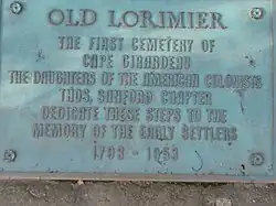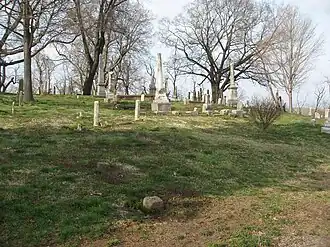 The Old Lorimier Cemetery in Cape Girardeau, Missouri was established between 1806 and 1808 by Louis Lorimier.[2] The cemetery is located at 500 North Fountain Street overlooking the Mississippi River.[3] There are believed to be more than 6,500 graves in the cemetery, most of them unmarked. A sidewalk serves as a north – south dividing line in the cemetery. It is said that Catholics are buried on the south and Protestants are buried on the north.[4] The east slope is believed to be the burial grounds of African-American persons. It has been recorded that as many as 1,200 soldiers from the Civil War were buried there. The grave marker for the wife of Louis Lorimier says "The Noblest Matron of the Shawnee race."[5][6][7]