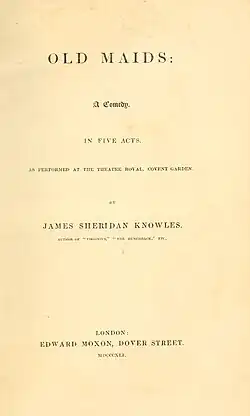 Old Maids is an 1841 comedy play by the Irish writer James Sheridan Knowles.[1] It was first staged at the Theatre Royal, Covent Garden in London on 12 October 1841.[2] The cast included John Harley as John Blount, George Vandenhoff as Thomas Blount, Walter Lacy as Robert, Robert William Honner as Harris, William Payne as Stephen, Alfred Wigan as Jacob, Lucia Elizabeth Vestris as Lady Blance and Louisa Nisbett as Lady Anne. It was produced towards the end of the theatrical career of Sheridan Knowles, before he turned to novel-writing.[3]