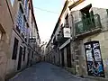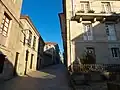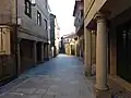 The Basilica of Saint Mary Major and the Convent of San Francis mark the strategic points from west to east of the old town on two hills. Between them, the medieval city with its labyrinth of streets (ruas) and medieval squares was shaped. The streets were structured around a main axis that corresponds to the present-day Sarmiento and Isabel II streets, and from there the rest of the streets were divided, forming a classic example of a medieval city with a fishbone-like plan, where the streets are structured from a single central axis onto which the secondary streets are grafted.[20] The Calle Real (Royal street) crosses part of the old town from north to south. Between the streets, the historic centre is dotted with squares of regular proportions, square or rectangular, with many noble houses with stone coats of arms, which air out the urban fabric and give it elegance.