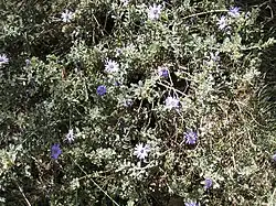 Olearia astroloba, commonly known as marble daisy-bush,[2] is a species of flowering plant in the family Asteraceae and is endemic to a restricted area of Victoria in Australia. It is a greyish shrub with sessile, spatula-shaped leaves and mauve or violet and purple, daisy-like inflorescences.