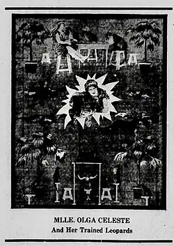 At Selig Zoo, Olga Celeste hosted leopard tea parties on Sundays.[2] Apparently Olga Celeste "called her leopards her babies and adored them precisely because, as she said, they were 'the most treacherous' of animals. Frequently dressed to resemble her leopards, Olga serves as an access point to another world if only because her animals have turned her into something 'other' even outside the realm of fiction."[19] In 1923 Mlle. Celeste took her leopard act to Aloha Park in Hawaii.[10] She also did stints with John Robinson Circus, Al G. Barnes Circus and Ringling Brothers.[2]