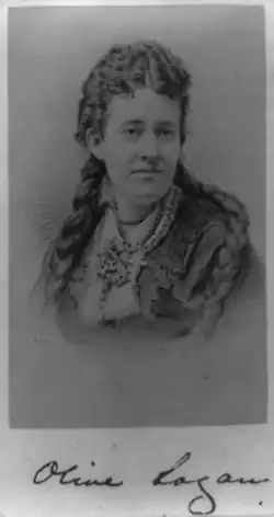 She was born in Elmira, New York, and attended Wesleyan Female College (1850–51) and the Catholic Academy of the Sacred Heart in Cincinnati, Ohio, where her theatrical family had settled. Her acting career was short, beginning with her debut at the Arch Street Theatre in Philadelphia in 1854 as 'Mrs. Bobtail' in Bobtail and Wagtail and ending in 1857 when she married journalist Henry A. Delisle[a] and went to Europe. While in Europe she became a journalist herself; her first book, Photographs of Paris Life (1861), was a collection of pieces on Paris life written for American periodicals.[1] An 1865 novel, Chateau Frissac: or, Home Scenes in France, "was written with the view of showing the evils resulting from the well-known French mariage de convenance"[2] Her 1866 story collection Olive Logan's New Christmas Story: John Morris's Money was reviewed as "not notably worse than most of the fiction of the day".[3] Olive was influenced by Artemus Ward to take up public speaking where she spoke on social and political topics. She returned briefly to the stage from 1864 until 1867. In 1864 she appeared at Wallack's Theatre in New York City in her own play of Eveleen. She corresponded for many periodicals and wrote, besides plays (including a metrical rendering of Coppée's La Pasant), a dramatization of Wilkie Collins's Armadale, and several books on theatrical matters, such as Before the Footlights and Behind the Scenes (1870). She also published the novels Get Thee Behind Me, Satan! (1872) and They Met By Chance (1873).