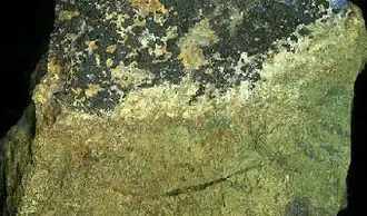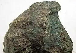 Olivenite is a copper arsenate mineral, formula Cu2AsO4OH. It crystallizes in the monoclinic system (pseudo-orthorhombic),[2] and is sometimes found in small brilliant crystals of simple prismatic habit terminated by domal faces. More commonly, it occurs as globular aggregates of acicular crystals, these fibrous forms often having a velvety luster; sometimes it is lamellar in structure, or soft and earthy.[5]
