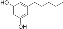 Olivetol is an organic compound with the formula C5H11C6H3(OH)2. Several isomers exist; olivetol has the two hydroxyl and the pentyl groups located at the 1,3, and 5 positions on the benzene ring. It is a colorless solid that is soluble in a variety of organic solvents. It is found in certain species of lichen. It is also a precursor in various syntheses of tetrahydrocannabinol.
