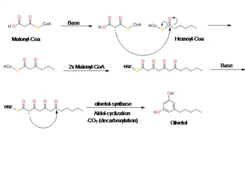 The data from Taura's study of OLS's enzyme kinetics show that OLS catalyzes a decarboxylative-aldol condensation to produce olivetol. This is similar to stilbene synthase's (STS) mechanism for converting p-coumaroyl-CoA and malonyl-CoA to resveratrol. Although olivetol is the decarboxylated form of OLA, it is highly unlikely that OLS produces olivetol from OLA.[10][11] Crude enzyme extracts prepared from flowers and leaves did not synthesize olivetolic acid, but only yielded olivetol.[10] The exact mechanism of olivetol biosynthesis is as yet unsure, but it is possible that an OLA-forming metabolic complex forms along with OLS.[10] In addition, it also appears that OLS only specifically accepts starter CoA esters with C4 to C8 aliphatic side chains such as hexanoyl-CoA.[10][12]