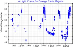 This star has a stellar classification of B2.5Ve, indicating it is a main sequence Be star, although it has also been classified as a subgiant.[15] One of the most observed Be stars of the Southern Hemisphere,[16] Omega Canis Majoris is classified as a Gamma Cassiopeiae-type variable star.[3] Both the luminosity and the radial velocity vary with a primary cyclical period of 1.372 days.[17] The variation in brightness, ranging from magnitude +3.60 to +4.18,[3] shows changes over time, which suggests there are two overlapping periods of 1.37 and 1.49 days. The star also undergoes transient periodicities following outbursts.[18][11]