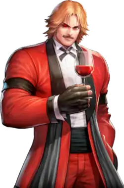 Standing 1.97 m (6 ft 5 in) tall,[10] Rugal is a tall, blonde and athletic man with a thin mustache and his right eye missing. His normal outfit consists of a red formal tailcoat suit with black accents, fingerless gloves, a black cummerbund and ribbon tie, and a white shirt underneath.[11] This outfit has been used for most of his casual appearances, including crossover titles such as Capcom vs. SNK: Millennium Fight 2000 and its sequel.[12] In The King of Fighters '94, when he is defeated the first time he will toss away most of his upper clothes, now wearing a black sleeveless undershirt with his suspenders dangling loose while, and fighting more seriously.[13]