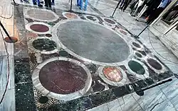 One of the most intriguing features of Hagia Sophia is a marble section of the floor known as the Omphalos. The Omphalos is located in the south-east quarter of the main square beneath the dome, exactly in the middle of the square. Each side measures 5.65 meters (18.5 feet). Within the square lay 30 circles of various sizes. There is one large circle in the middle; 4 circles of equal size at each corner; 2 smaller circles of similar size occupy the space between each corner circle; 16 smaller circles in-between these. The 3 remaining circles are on the south end and are linked to the 4 larger circles on that end.[1]