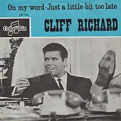 Cliff Richard recorded his version of "On My Word" whilst in Nashville, Tennessee in August 1964 and features backing vocals by the Jordanaires and an orchestra conducted by Stan Applebaum.[1] It was released as a single in June 1965 with the B-side "Just a Little Bit Too Late" written by Hank Marvin and recorded with the Shadows.[3]