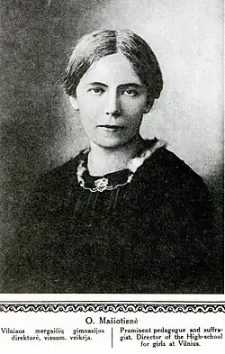 Ona Mašiotienė née Brazauskaitė (Polish: Anna Brzozowska; 9 September 1883 – 29 December 1949) was a Lithuanian teacher and principal, women's rights activist and writer. She helped found the Lithuanian Women's Association, the first women's rights organization in the country, and lectured on the need for equality of men and women. Pressing for both women's rights and Lithuania's independence, she served as a member of different societies and a delegate to several political conferences and assemblies. As a teacher, she organized the first Lithuanian-language girls' gymnasium in Vilnius and was the principal of a secondary school in Kaunas for over a decade. In 1921, she was elected to serve on the Utena regional council for two terms. She was one of the co-founders and the first president of the umbrella Lithuanian Women's Council. Recognized by the independent Lithuanian government with national awards, she was dismissed from her teaching post after the Soviets reestablished authority over the country.