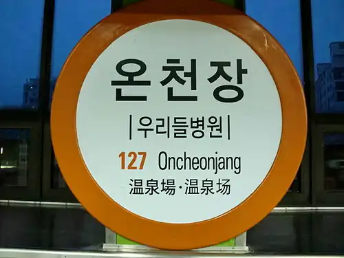 Oncheonjang Station (Korean온천장역; Hanja溫泉場驛) is a station of Busan Metro Line 1 in Oncheon-dong, Dongnae District, Busan, South Korea.