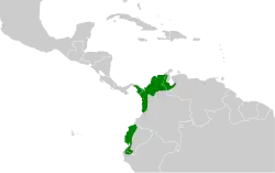It is found in Colombia, Ecuador, Panama, Peru, and Venezuela. Its natural habitats are subtropical or tropical dry forest, subtropical or tropical moist lowland forest, and heavily degraded former forest.