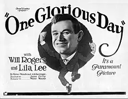 One Glorious Day is a lost[1][2] 1922 American silent fantasy comedy film directed by James Cruze and written by Barry Barringer and Walter Woods. The film stars Will Rogers, Lila Lee, Alan Hale, Sr., Johnny Fox, George Nichols, and Emily Rait. It was released on January 29, 1922, by Paramount Pictures.[3][4][5] Working titles included Ek, A Fighting Soul and Souls Before Birth.[6] Forrest J. Ackerman, the publisher of Famous Monsters of Filmland magazine, credited this film as being the one that "created his lifelong interest in science fiction and horror".[7]