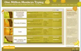 One Million Monkeys Typing allowed users (referred to as "monkeys") to collaboratively write stories in short snippets.[1][7] Each new user-contributed story snippet—called a "trunk" in the site's tree-themed parlance—could be added to or "grafted" upon with up to three subsequent snippets.[1][7] Story snippets varied in length, with maximum word counts between 50 and 300, and the site and its contents were distributed under a Creative Commons NonCommercial license.[1][6] The site allowed users to rank and comment on snippets so that popular ones persisted and grew while unsuccessful paths would "wither and die".[8] Beyond this, there was negligible editorial control over the site's branching stories.[9]