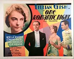 One Romantic Night is a 1930 American pre-Code romantic comedy film directed by Paul L. Stein. It is the first sound film version of Ferenc Molnár's play The Swan, and marked silent screen star Lillian Gish's talkie debut. She starred as Princess Alexandra, with Conrad Nagel as the tutor who falls in love with her, and Rod La Rocque as Crown Prince Albert. In this version, Alexandra and the Prince elope at the end.[1] The film was only fairly successful, though Gish would go on to become as highly regarded in talking pictures as she had been in silent films.