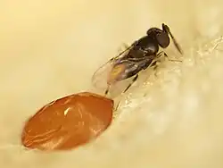 | Oobius agrili adult laying an egg within an emerald ash borer egg. | |