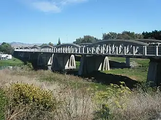 The Opawa River Bridge is a reinforced concrete bowstring truss bridge in Blenheim, New Zealand that crosses the Ōpaoa River. The bridge is classified as a "Category I" ("places of special or outstanding historical or cultural heritage significance or value") historic place by the Heritage New Zealand, formerly known as New Zealand Historic Places Trust.[1] The bridge was first built in 1869 but collapsed in 1878. A new bridge was not completed until the end of 1917.[1]