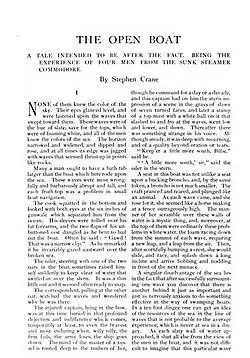 "The Open Boat" is a short story by American author Stephen Crane (1871–1900). First published in 1898, it was based on Crane's experience of surviving a shipwreck off the coast of Florida earlier that year while traveling to Cuba to work as a newspaper correspondent. Crane was stranded at sea for thirty hours when his ship, the SS Commodore, sank after hitting a sandbar. He and three other men were forced to navigate their way to shore in a small boat; one of the men, an oiler named Billie Higgins, drowned after the boat overturned. Crane's personal account of the shipwreck and the men's survival, titled "Stephen Crane's Own Story", was first published a few days after his rescue.
