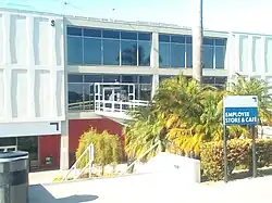 Bldg. S ("service") at Space Park showing staircase leading down to S-Cafe cafeteria. Denevans descended this to attack the Enterprise crew under the walkway seen in the center leading to the 1st-floor entrance. Also visible is the red-tiled wall near the lower-level entrance where Mr. Spock engaged in hand-to-hand combat with a Denevan.