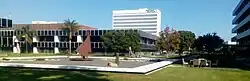 Historic quad courtyard plaza at Space Park with 75'×75' (23×23 m) reflecting pool (now filled with dry gravel for water conservation) where the crew beamed down from the starship Enterprise.